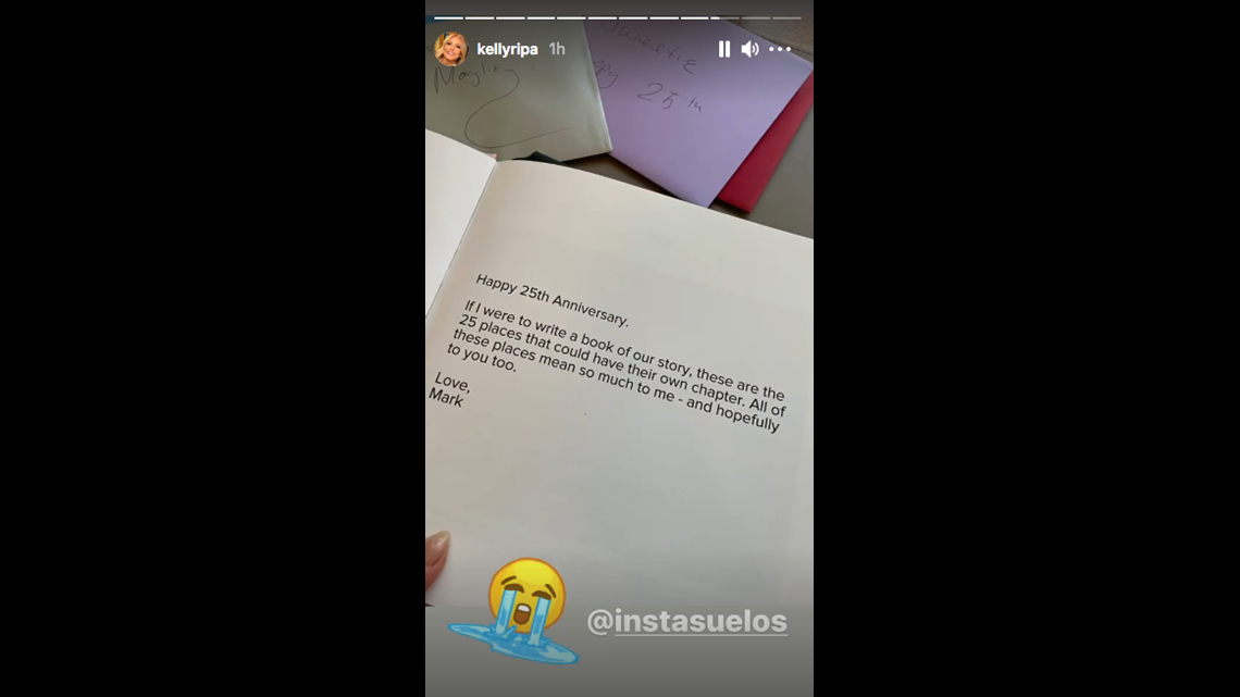 In one IG Story, Ripa shows her husband's romantic note, which reads, "If I were to write a book of our story, these are the 25 places that could have their own chapter. All of these places mean so much to me - and hopefully to you too."